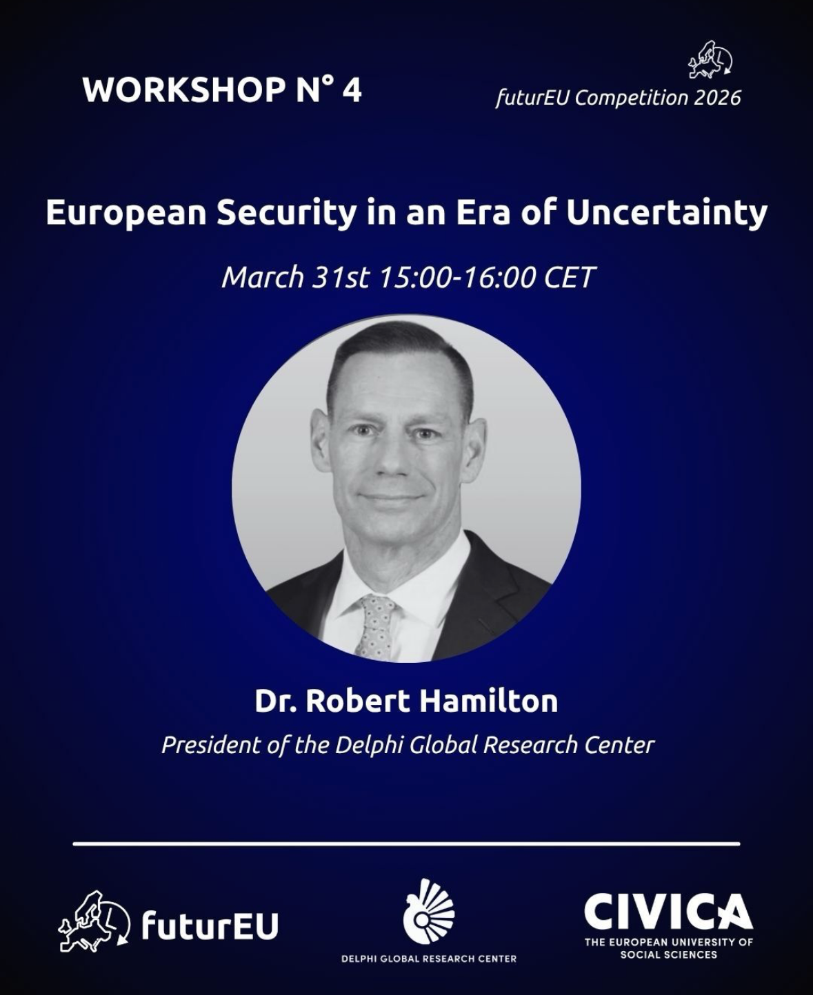 Our fourth workshop of this yearβs futurEU Competition will feature Dr. Robert (Bob) Hamilton, President of the Delphi Global Research Center. A former U.S. Army Colonel with 30 years of military service and six years as a civilian professor at the U.S. Army War College, Dr. Hamilton brings extensive exertise in transatlantic security, Eastern Europe, and international relations.