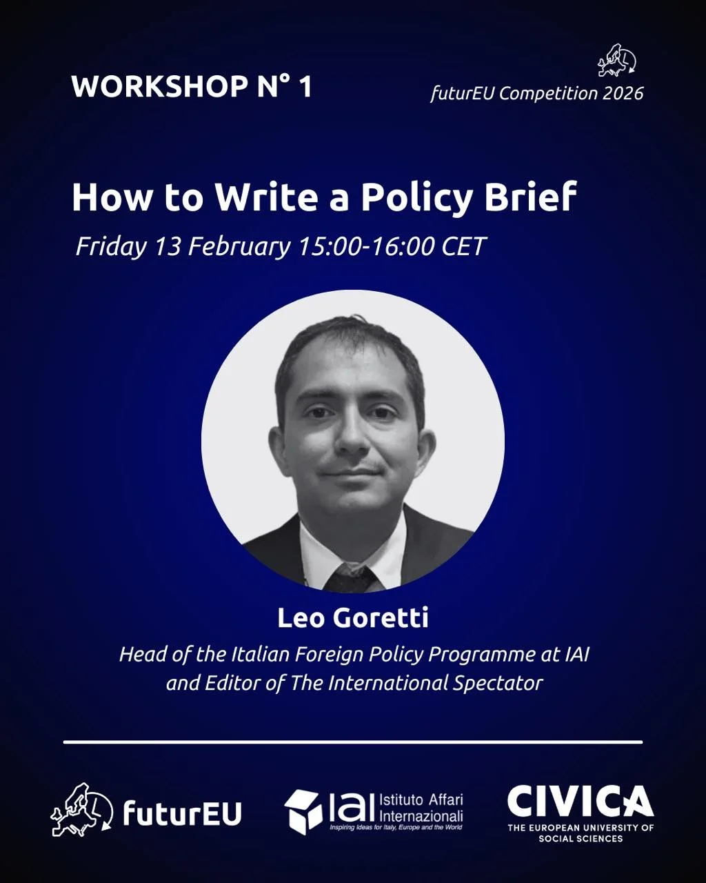 Across the workshop series, we will cover a broad range of topics, from how to write a strong policy brief and craft clear recommendations to wider themes connected to European security, resilience, and policy making. Whether you are just getting started or already have experience, the workshops are a great opportunity to learn, get feedback, and connect with others involved in the competition.